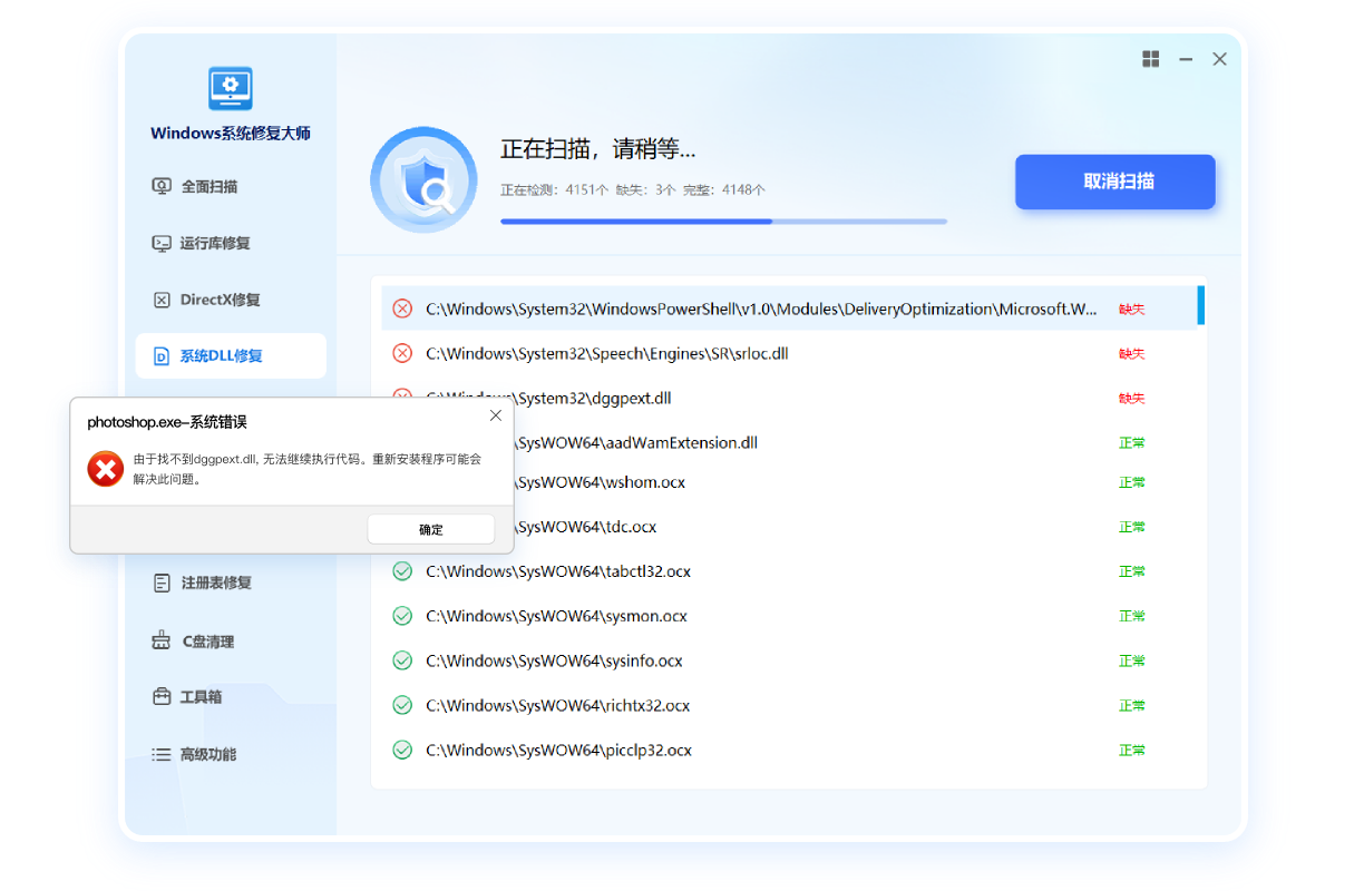 智能修复DLL缺失导致的电脑异常系统DLL组件和其他组件缺失解决软件运行异常、闪退等问题解决电脑开机异常、错误弹窗问题 -